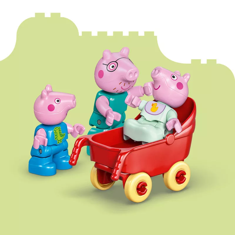 A sorozatban láthatóhoz hasonlóan ez a kétszintes LEGO DUPLO játék ház külön szobákkal rendelkezik Zsoli és Peppa malac számára, valamint konyhával, fürdőszobával és nappalival is fel van szerelve. Ez a fantáziadús játék arra ösztönzi a kislányokat és kisfiúkat, hogy a sorozatból ismert jeleneteket és a saját otthonukban megszokott rutinokat, például az alvás előtti készülődést vagy a családi reggelit eljátsszák.