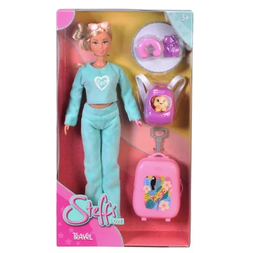 Csomagolás tartalma1 db Steffi Love baba ruhában, 1 db gurulós bőrönd, 1 db hátizsák, 1 db kiskutya figura, 1 db nyakpárna, 1 db napszemüveg