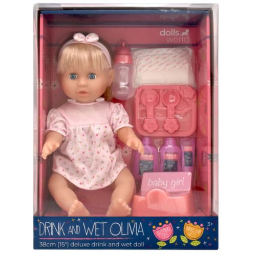 A Dolls World Olivia egy bájos, 38 cm-es játékbaba, amely valósághű gondoskodási élményt nyújt az „iszik és pisil” funkciójával. A számos kiegészítő, mint a bili, cumisüveg és pelenka, kreatív és fejlesztő szerepjátékra ösztönzi a gyerekeket.