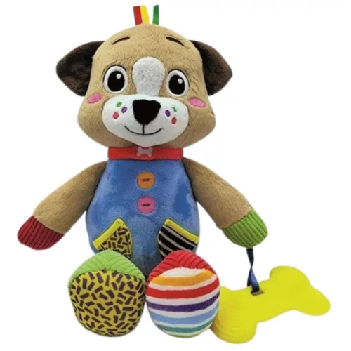 A tervezők a fogzási időszak kihívásaira is gondoltak. A kutyus egyik mancsához egy puha műanyagból készült, csont alakú rágóka van rögzítve. Ez a praktikus kiegészítő enyhülést nyújt a baba érzékeny ínyének, és mivel a játékhoz van erősítve, sosem veszik el, mindig kéznél van, amikor a legnagyobb szükség van rá.