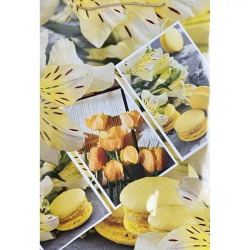 A dísztasak dizájnja egy gondosan összeállított fotókollázs, amely a sárga szín meleg és vidám árnyalataira épül. A kompozícióban sárga és fehér perui liliomok, egy nyitott könyvön pihenő tulipáncsokor, valamint ínycsiklandó sárga makronok láthatók. Ez a kifinomult minta minden korosztály számára tetszetős, és egy csipetnyi tavaszi hangulatot csempész az ajándékozásba.