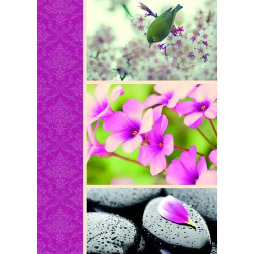 A dizájn egyedi és szemet gyönyörködtető. Az oldalán végigfutó elegáns, lila damaszt minta kifinomult keretet ad a táska központi elemeinek. A főoldalon egy három képből álló, harmonikus kompozíció látható, amely a természet szépségét ünnepli.