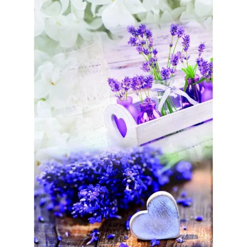 A dizájn egy idilli, rusztikus jelenetet ábrázol: egy fehér, szív alakú kivágással díszített fa ládában vázákba rendezett levendulacsokrok láthatók. Az előtérben egy különálló csokor és egy fa szív dekoráció teszi teljessé a hangulatos képet. A lila és fehér színek harmonikus kombinációja minden korosztály számára vonzóvá teszi ezt az ajándéktasakot.