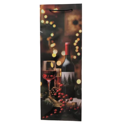 Tegye ajándékát még különlegesebbé ezzel az elegáns, lakkozott felületű italos tasakkal! Az ünnepi, bogyós-boros fotónyomat stílusos megjelenést kölcsönöz, ideális választás egy üveg bor vagy pezsgő átadásához.