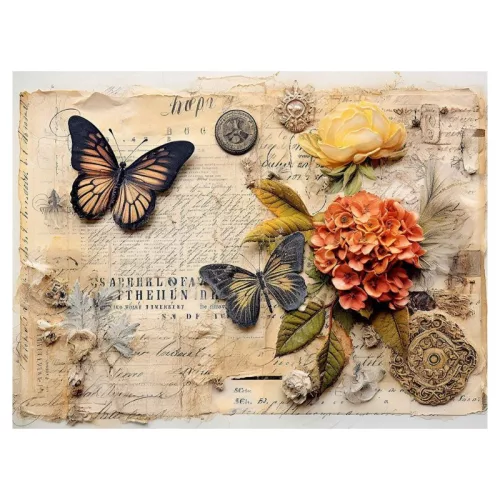 Pillangókat, virágokat és régi kézírást ábrázoló, nosztalgikus hangulatú minta.