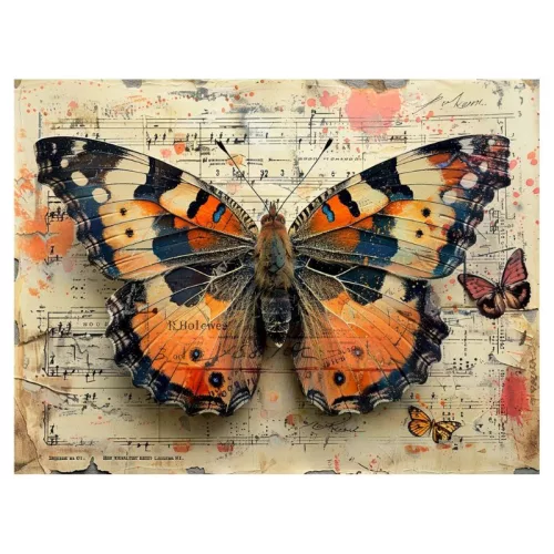 Az ajándékozás öröme már a csomagolásnál kezdődik. Ezzel a gyönyörű, pillangó mintás dísztasakkal garantáltan emlékezetessé teheti az átadás pillanatát. A táska központi eleme egy részletgazdagon ábrázolt, színpompás pillangó, amely egy vintage hangulatú, kottákat és finom festékpöttyöket idéző háttéren kapott helyet. Ez a művészi kompozíció egyedi és kifinomult stílust sugároz.