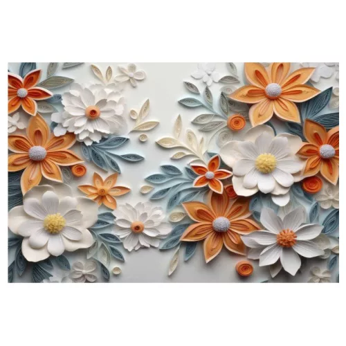 A narancs és fehér virágokból álló, művészi kompozíció szemet gyönyörködtető és egyedi.