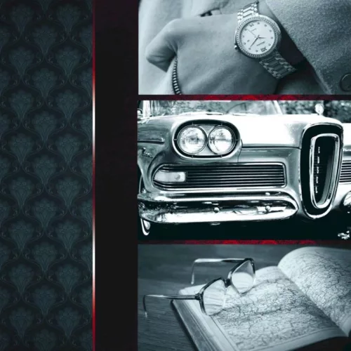 A karórát, veteránautót és könyvet ábrázoló fekete-fehér képek időtlen és stílusos hangulatot teremtenek.