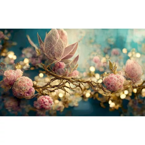 A tasak dizájnja egy álomszerű jelenetet ábrázol: rózsaszín és lila árnyalatú, texturált magnóliavirágok pihennek arany színű indákon, mindez egy elmosódott, türkizkék háttér előtt, melyet finom fénypontok tesznek még varázslatosabbá. Ez a részletgazdag és harmonikus színvilágú ajándéktasak garantáltan kiemeli az ajándékot a többi közül.