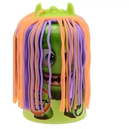 A tégelyből kibuggyanó narancssárga és lila putty a szörnyecske bolondos haját alkotja. A gyerekek kedvükre nyújthatják, formázhatják és gyúrhatják ezt a különleges anyagot, ami végtelen lehetőséget kínál a kreatív játékra. Készítsenek fonatokat, kontyokat vagy egy teljesen egyedi, borzas frizurát a kis szörnynek!