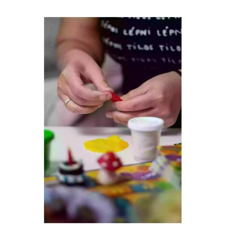 A doboz 6 tégely színes gyurmát, játéktáblát és több pakli feladványkártyát is tartalmaz, így a kicsomagolás után azonnal kezdődhet a játék.