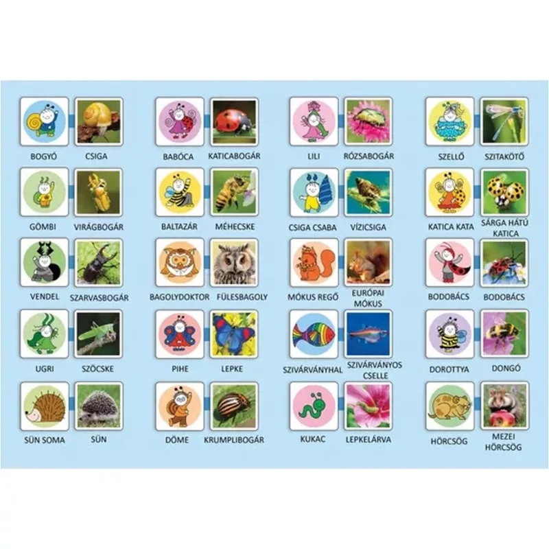 A játék célja egyszerű: a lefordított kártyák között kell megtalálni a párokat. A 2x20 darab, strapabíró kartonból készült kártyalapon Bogyó, Babóca, Pihe, Lili és a többi imádnivaló szereplő köszön vissza és való életbeli párjaik, ami garantáltan leköti a gyerekek figyelmét és növeli a játékélményt.