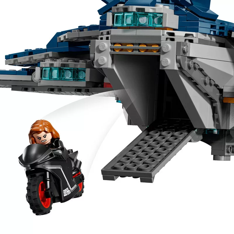 A szett központi eleme a Quinjet, a Marvel filmes univerzum egyik legismertebb repülőgépe, amely részletgazdagságával és sokoldalúságával garantáltan lenyűgözi a gyermekeket és a felnőtteket egyaránt. A repülő pilótafülkéje felnyitható, orr-része 2 korongvetővel van felszerelve, és külön tárolórekeszt is tartalmaz, ahová elhelyezhetők Fekete Özvegy fegyverei vagy Sólyomszem íja. A hátsó ajtó szintén kinyitható, így a motorral való ki- és behajtás is zökkenőmentes, tovább fokozva a játékélményt.