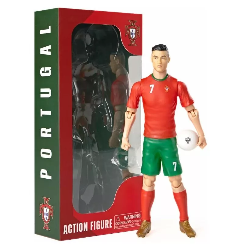 A kb. 18 cm magas figura hűen ábrázolja Ronaldót: a híres portugál válogatott piros mez, a nemzeti címer, a 7-es mezszám és az ikonikus arcvonások mind-mind gondosan kidolgozottak. A figura mozgatható végtagjainak köszönhetően izgalmas jelenetek játszhatók el: gólöröm, szabadrúgás, sprint vagy fejes – Ronaldo legendás mozdulatai most megelevenedhetnek a gyerekek kezei között!