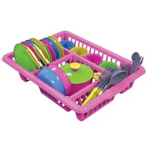 Ez a 32 darabos, élénk színű műanyag étkészlet mindent tartalmaz, amire a kis szakácsoknak szükségük lehet egy finom ebéd elkészítéséhez és tálalásához. A praktikus csepegtető tálcának köszönhetően a játék utáni rendrakás is egyszerű és szórakoztató.