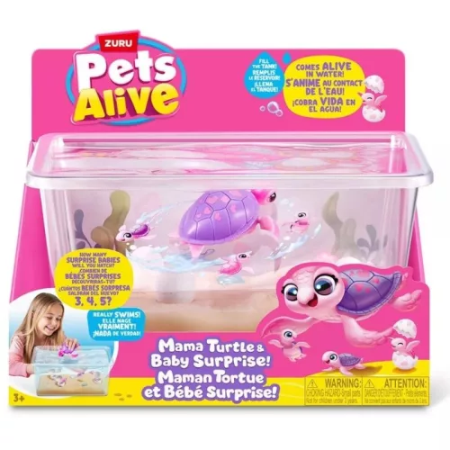 Fedezze fel a Zuru Pets Alive Mama és bébi teknős játékszett varázslatos világát! Töltse fel az akváriumot vízzel, és figyelje, ahogy a tojásokból kikelnek a cuki kis teknősök, miközben a mama teknős élethűen úszkál és sétál.