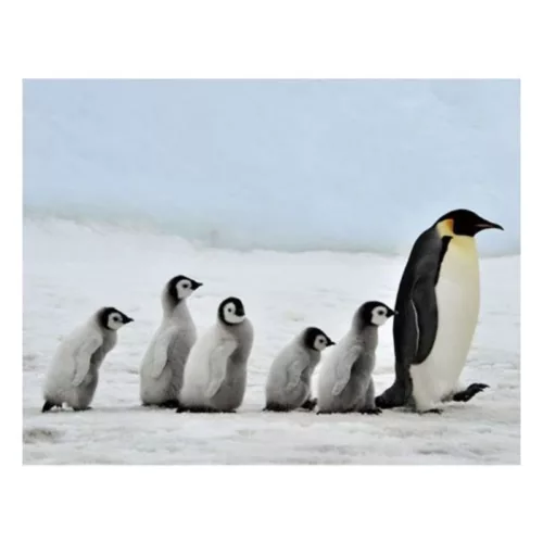 Hozzon egy darabka Antarktiszt a konyhájába ezzel a lenyűgöző, királypingvineket ábrázoló hűtőmágnessel! A képen egy gondoskodó szülőpingvin látható öt aranyos fiókájával a havas tájban, egy igazán szívmelengető családi pillanatot megörökítve. Ez a dekoráció garantáltan mosolyt csal mindenki arcára, aki a konyhában jár.