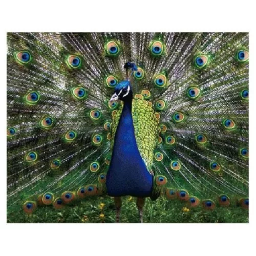 A páva tollazatának és színeinek aprólékos ábrázolása valósághű és esztétikus megjelenést kölcsönöz.