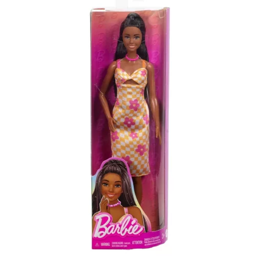 Barbie Fashionista barátok divatbaba – Stílusos baba sárga kockás virágmintás ruhában (233)