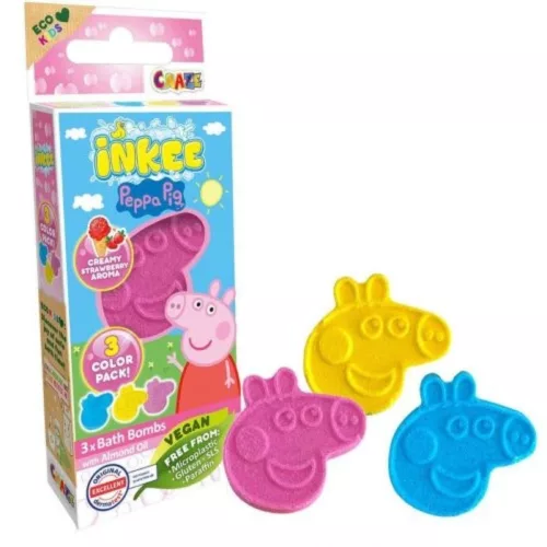 Varázsolja a fürdést vidám kalanddá a Craze Inkee Peppa malac fürdőformáival! A 3 darabos, vegán és bőrbarát szett kellemes eper illattal és gyengéd pezsgéssel teszi különlegessé a pancsolást.