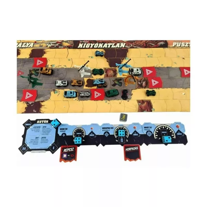 A játékmenet pörgős és kiszámíthatatlan, ahol a dobókocka veti meg a sorsát. Minden körben taktikai döntéseket kell hoznia: gyorsít, hogy előnyre tegyen szert, vagy támadást indít a riválisok ellen? Használjon gépfegyvereket, rakétákat, vagy egyszerűen csak ütközzön neki az ellenfélnek, hogy látványos robbanások és roncsok közepette biztosítsa be a pozícióját. A moduláris játéktábla garantálja, hogy minden egyes futam egyedi és megismételhetetlen kihívást jelentsen, ahol a túlélés a legfőbb cél.