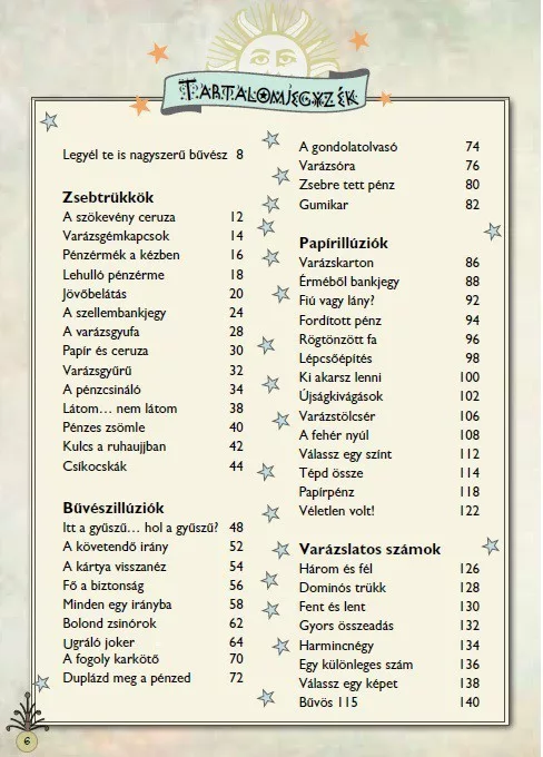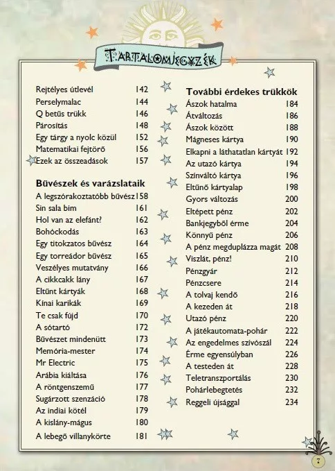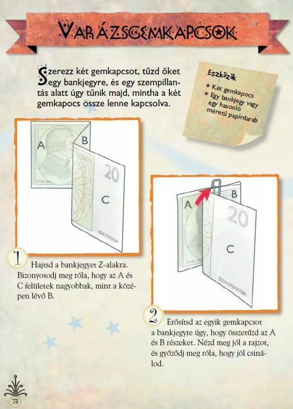 Nézz körül a környezetedben és megtalálod a varázs eszközeid!A Bűvészkönyv olyan trükkök gyűjteménye amelyekkel bármikor bárkit könnyen elkápráztathatunk, hiszen egyszerű elsajátítani őket és csak olyan eszközökre van szükség hozzájuk, amik minden háztartásban megtalálhatók!Ha nincs mi lekössön egy unalmas délután, vagy csak rögtönözni kell egy kis show műsort, nagy segítség, ha kéznél van a Bűvészkönyv! Cérnafűzött könyv, melyet 8 éves kortól ajánlunk. Oldalak száma: 240. ISBN: 9789634459521. Méret: 150x210 mm.