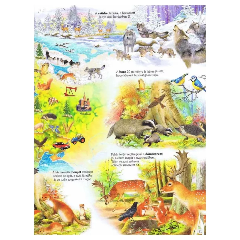 Látványos rajzok és térképek segítik az állatok és élőhelyeik vizuális beazonosítását, élményszerűvé téve a tanulást.