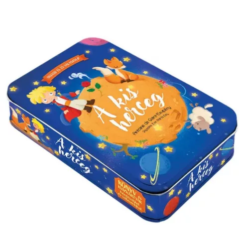 Csomagolás tartalma1 db keménytáblás "A kis herceg" könyv (64 oldalas), 1 db kvízjáték kártyacsomag, 1 db fém díszdoboz