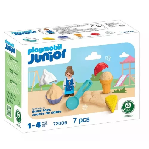 Készítsen fantasztikus homokfagylaltokat a Playmobil Junior Homokjégkrém Szalon készlettel! Ez a 7 darabos, fenntartható anyagokból készült szett tökéletes a kreatív szerepjátékokhoz a homokozóban és a gyerekszobában egyaránt.