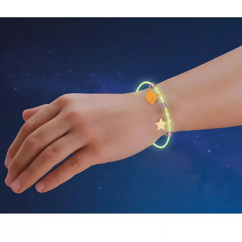 A készlet egy igazán különleges kiegészítőt is rejt. A csomagban található egy sötétben világító szilikon karkötő, amely mutatja az utat a csillagok között. A karkötő a mellékelt gyöngyökkel és a bolygó, illetve csillag alakú charmokkal egyedivé tehető, így a gyermekek is viselhetik a saját űrkalandjuk egy darabját.