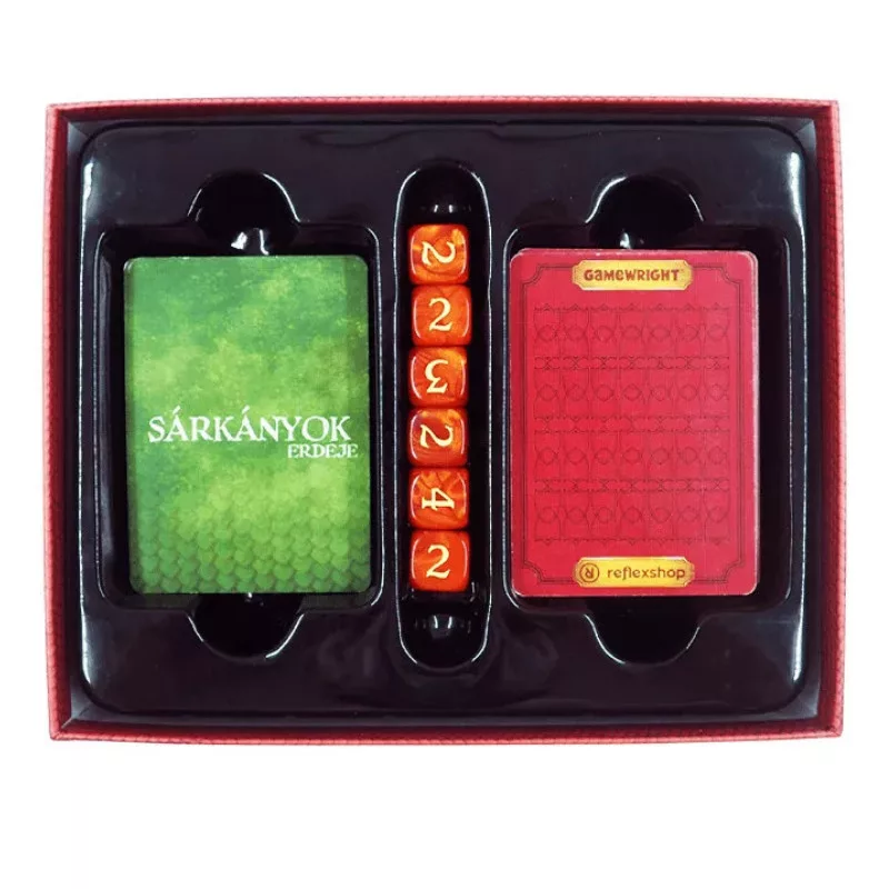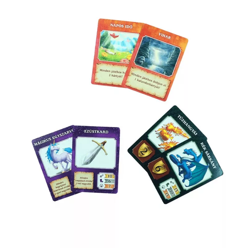 Csomagolás tartalma108 db kártya (64 kalandorkártya, 42 erdőkártya), 6 db egyedi dobókocka, 2 db segédletkártya, 1 db magyar nyelvű játékszabály