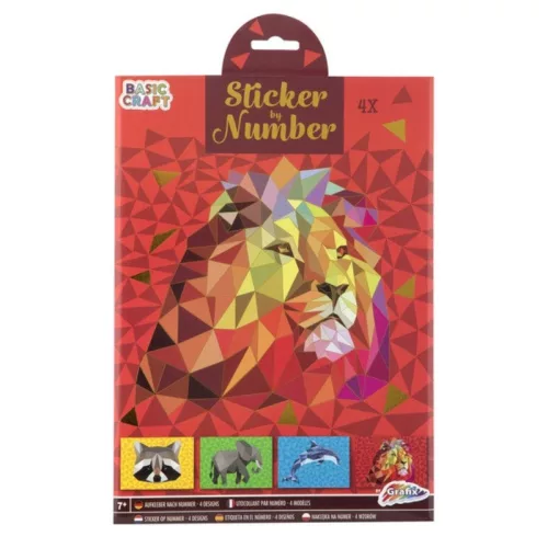 Csomagolás tartalma4 db előrajzolt, számozott kép (oroszlán, elefánt, delfin, mosómedve), 4 ív színes mozaikmatrica
