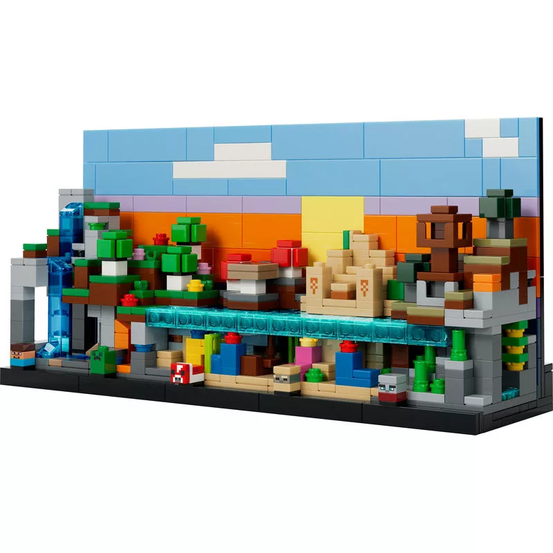 A LEGO Minecraft készlet 5 leemelhető biomot tartalmaz: hegy – cseppkőbarlanggal, ametisztgeódával és vízeséssel; virágerdő – barlanggal, lávával és arannyal; gombamező – korallzátonnyal, hajóronccsal, 2 piros gombafával és egy barna gombával; sivatag – templommal, korallzátonnyal, óceánnal, kaktusszal és kincsesládával; szavanna – a fosztogatók őrtornyával a parton, buja barlanggal, akáciafákkal, sütőtökkel, lávával és tengerparttal. A szett tartalmaz egy megfordítható (nappal/éjszaka) hátteret is. Ez a készlet nagyszerű gaming ajándék Minecraft játékosoknak és LEGO rajongóknak. A LEGO Builder appal pedig a gyerekek magabiztosan építhetnek: 3D-ben felnagyíthatják és megforgathatják a modelleket, és követhetik a haladásukat a könnyen átlátható digitális útmutatókkal. A szett 797 elemből áll.