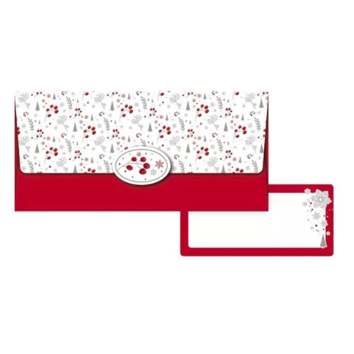 Adja át a karácsonyi pénzajándékot vagy utalványt stílusosan ebben az elegáns, bogyós mintával díszített piros díszborítékban. A csomag egy külön ajándékkísérő kártyát is tartalmaz a személyes jókívánságok számára.