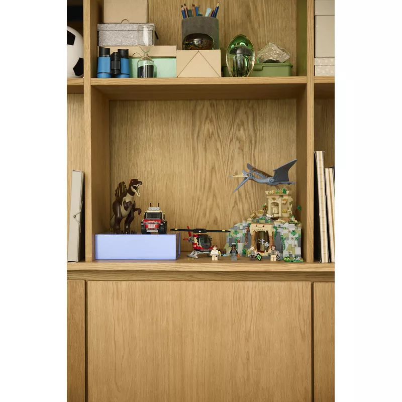 A látványos, film ihlette szett a LEGO építési élményét ötvözi a Jurassic World világának akciódús hangulatával, így nemcsak az építés, hanem a történetmesélős játék is központi szerepet kap. A dobozban két nagyméretű dinoszauruszfigura található: a Spinosaurus mozgatható lábakkal, karokkal, farokkal, fejjel és állkapoccsal rendelkezik, míg a Quetzalcoatlus állítható szárnyai és állkapcsa teszik még élethűbbé a játékot.