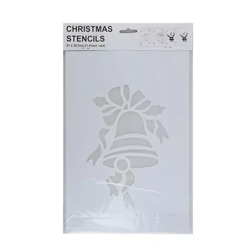 Készítsen lenyűgöző ünnepi dekorációkat egyszerűen ezzel az újrahasználható, csengő mintás karácsonyi stencillel. Ideális ablakok, textíliák vagy ajándékcsomagolások díszítésére műhóval vagy festékkel.