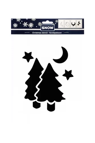 Varázsoljon ünnepi hangulatot otthonába ezzel a fenyőfás, csillagos és holdas karácsonyi stencil sablonnal! Ideális választás ablakok, falak vagy textíliák gyors és egyszerű díszítéséhez műhóval vagy festékkel.