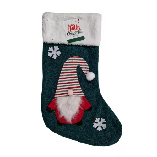 A zöld alapszínű csizmát egy vidám, csíkos sapkás, nagy fehér szakállú manó díszíti, aki mintha csak az ajándékokat őrizné. A hópelyhekkel kiegészített dizájn igazi téli hangulatot teremt. A puha, plüss fehér szegély eleganciát kölcsönöz neki, és tökéletesen illeszkedik a hagyományos karácsonyi dekorációk sorába.