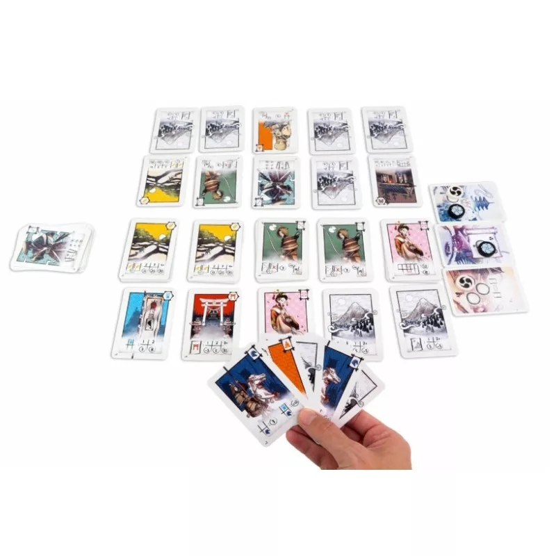 Csomagolás tartalma16 db Hegy kártya, 34 db Fejlődés kártya, 1 db Császári Udvar tábla, 4 db Követ jelölő, 1 db Kezdőjátékos kártya, 4 db Segédlet kártya, 1 db Pontozótömb, 1 db játékszabály