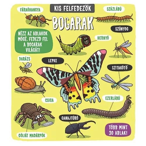 Lapozás közben a gyerekek olyan izgalmas lényekkel találkozhatnak, mint a fáraóhangya, a hernyó, a góliát madárpók vagy a színpompás lepke. Minden egyes ablak felnyitása egy "aha!" élmény, amely kielégíti a természetes kíváncsiságukat és új ismeretekkel gazdagítja őket. A könyv játékos formában mutatja be a bogarak sokszínűségét, a legijesztőbbektől a leggyönyörűbbekig.