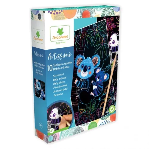 Ismerje meg a Sycomore Artissimo karckép készítő készletet, amely egy varázslatos utazásra hívja a gyermekeket a művészet világába! A készletben található fekete lapok rejtett, élénk színeket takarnak, melyeket a mellékelt karctoll segítségével lehet előhívni. Az alkotás folyamata egyszerű, mégis lenyűgöző, ahogy a vonások nyomán feltűnnek az aranyos bébi állatok, mint például a panda, a koala vagy a róka.